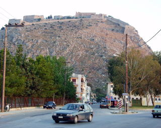 見上げると山の上に城壁が連なっています。ナフプリオの城です。写真に向かって左側に500メートルほど行くと、城へ上る道があります。車で城門のすぐ側まで行けます。