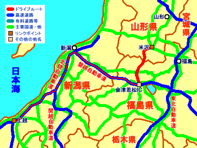 -蔵王温泉-(国道13号線)-米沢市-(国道-会津若松市-(磐越自動車道・北陸自動車道)-上越市-(関越自動車道)-東京 行程約350km