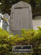 高輪界隈には元和キリシタンの遺跡が2カ所あります。元々は同じものですが、一つはJR田町駅から品川寄りに500bほど、札の辻交差点から200bほどの三田ツインビル西館の公開空地=写真・左=。もう一つは品川駅から高輪プリンスホテル方面への坂を上り切った角にあるカトリック教会の玄関にあります=写真・右=。 札の辻に近いツインビルの公開空地は緩い階段の先に大きな石が置かれ、元和キリシタン遺跡、の標示と説明があります。ツインビルは大きな茶色の建物でガラスが多い高層なのですぐ分かります徳川三代将軍・家光が元和九年(1623年)10月13日、キリシタンを処刑したとあります。徳川実記に記されているもので、京都に通ずる東海道の入口に当たる丘が選ばれたと考えられ、今はない“智福寺”地内であろうと推定されています。寛永15年(1638年)12月3日にも同じ場所でキリシタンが処刑されていると東京都教育委員会の説明文があります。広い敷地に緩やかな階段があり、その先に遺跡としての標示や石が据えられているが、お寺の痕跡はビル建設などの影響で全くありません。 一方、カトリック教会の玄関先にある石碑は1956年に信者が三田の遺跡、智福寺に作り、その後石碑を移したもので、同じ処刑跡のものです。こちらは“江戸の大殉教”と説明にありました。説明文は教育委員会のものと基本は同じですが、日付が異なります。教会の方は1623年12月4日とありますが、教育委員会は10月と12月3日です。いずれにしてもキリシタン禁制の中で江戸にも大勢いた信者が処刑されたのははっきりしています。キリシタンというと天草ですが、江戸の徳川幕府のお膝元でも、こういうことがあったのか、と改めて思った次第です。 |