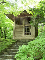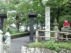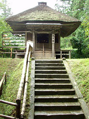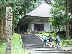 ![]() ●雨の古刹 中尊寺 東北自動車道を北上、約100km、平泉前沢ICを出る。まもなく中尊寺の境内下の駐車場に着く。 大粒の雨も小雨に変わり、しっとり濡れる緑の木立の中を平泉町営駐車場から国道4号線を挟んで 月見坂を登る。