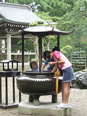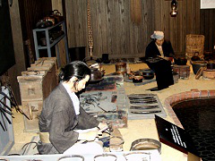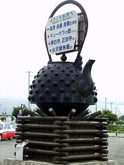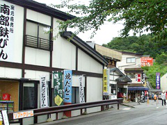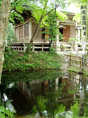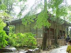 ![]() 大日堂 ![]() 芭蕉の像(左)と旧金色堂覆堂 ![]() 能楽堂 金色堂 平安後期の阿弥陀堂建築で、藤原四代の廟。芭蕉が詠んだように光堂とも呼ばれ、床や天井、壁面まですべてを 金箔で飾られ、四本の巻柱は七宝がはめ込まれている。堂内中央には初代藤原清衡、左は二代基衡、右は三代秀衡 の遺骸と四代泰衡の首が収められた須弥壇(しゅみだん)があり、各壇上には本尊阿弥陀如来を中心に11体の仏像 が安置されている。 ![]() 金色堂(覆屋の中にある) 建物屋根は美しい曲線 江戸時代から幾度となく修理が行われてきたが、明治と昭和の数回にわたる大補修に 昭和26年(1951)、文化財保護法により国宝建造物第一号に指定された。昭和25年 (1950)須弥壇に安置された藤原四代公の学術調査が行われた。この調査により四代 泰衡の首桶から発見されたハスの種が平成10年に開花に成功、「中尊寺ハス」とし て話題を集めたのを記憶している人も多いだろう。以降初夏には清楚な花を咲かせて いるという。 建当時の輝きを取り戻した。現在、外から見える建物は、金色堂を包む覆堂だ。内部 は残念ながら撮影禁止だ。 ![]() 苔・杉・灯籠… ○讃衡蔵(さんこうぞう) 中尊寺の17ヶ院に伝わる秘宝や資料を集めた宝物庫で清衡、基衡、秀衡三代をもって名付けられたもので国宝や 重要文化財3000点余りを収蔵している。必見は永久5年(1117)から8年をかけて清衡が書写した“紺紙金字交書 一切経”だ。日本写経史上の頂点といわれている。 の滅亡後、兄の頼朝に追われ藤原秀衡を頼りここ平泉に落ち延びてきた。 しかし、義経の庇護者であった秀衡はまもなくこの世を去り、頼朝の力に屈した四代泰衡は義経を攻めた。北上川ほとり の高台衣川館にいて急襲を受けた義経は、館に火を放ち妻子とともに自害した。その衣川館が現在の「高館義経堂」だ。 ている。 ![]() 参道から衣川を望む ![]() 参道入り口には土産物屋が賑やか このほか平泉には平安時代の庭園遺跡がほぼ完全に残るという「毛越寺(もうつうじ)」、弁慶の墓などもある。 ●南部鉄瓶(南部鋳物)の町 水沢 水沢は南部鉄瓶のふるさとだ。東北新幹線水沢駅西口の羽田町一帯には約60余もの鋳物工場が点在する。 となる伝統的な鋳物の産地である。後に伊達藩の保護のもとに大きく発展し、明治中期には鍋釜などの日用品の生産 地として東北一を誇っていた。 ![]() 水沢は南部鉄の町(新幹線駅前) 戦後は再び日用品鋳物から南部工芸鋳物産地として復活。現在は鋳物が美術品にまで高められ、それぞれ著名 な作者により新しい鋳物作品が、生み出されている。駅前の伝統産業会館には各工房で作られた作品が展示さ れている。また製造過程を人形を使って教えてくれる。 ![]() 昔の鉄加工。人形がその様子を見せている 若い人の中には鉄瓶といってもピンとこない人もいるかもしれないが、炭火に鉄瓶でゆっくり湧かした湯は 水道のカルキの匂いも消してやわらかくうまい。その上、鉄分が含まれていて健康にもよい。 ![]() 北上川 |