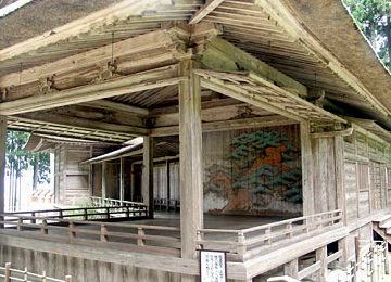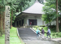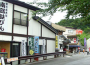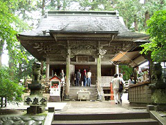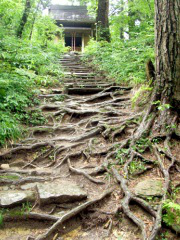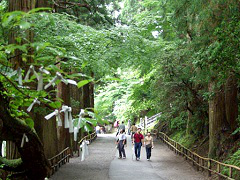 参道は杉、楓の並木 参道脇に洒落た茶屋 大日堂、鐘楼、阿弥陀堂などの奥には釈迦堂や能楽堂があり、松尾芭蕉が“奥の細道”道中で