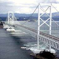 明石市から淡路島を通り鳴門海峡をまたいで結ぶ神戸淡路鳴門自動車道は昭和60年(1985)に着工、約10年の歳月をかけて完成した。大鳴門橋は全長1629m、主塔高144mの長大な吊り橋だ。