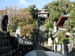 ![]() 二十五番札所、津照寺は長い階段の上 この寺は、室戸の漁師の安全を祈願して弘法大師が延命地蔵を刻んだという。その後、土佐の藩主・山内一豊 や長宗我部氏などの手厚い庇護を受けたが、明治の神仏分離令によって廃寺の危機に見舞われながらも存続。 |