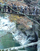 ![]() 押すな押すなのかずら橋 祖谷渓は、四国の中央部剣山から流れる祖谷川の下流で断崖絶壁のV字形の谷で約10kmに渡る風光明媚な 景勝地だ。 |