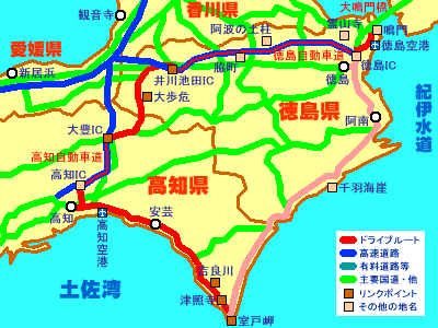 −室戸岬−高知市−(高知自動車道)−大豊町−(国道32号線)−大歩危・小歩危・祖谷渓−池田町−