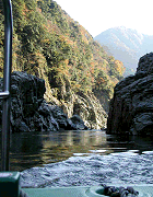 奇岩の連なる両岸は初夏の新緑、夏の深い緑、秋の紅葉と目を楽しませてくれる。とくに川下りの遊覧船