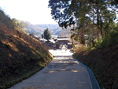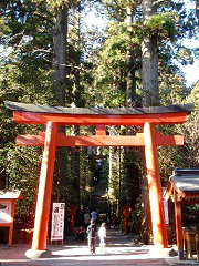 元箱根、芦ノ湖上の朱色の鳥居から三鳥居まで石段の参道が一直線に続く。石段の数は約200段、その上に本殿がある。 |