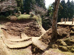 広い敷地に堀障子と呼ばれる空堀や曲輪、土塁、櫓台、井戸、池などが残る。みどころは空堀で、いまでも結構深いが、往時は今より2m以上も深かったというから、急な赤土の斜面を登るのは攻める側も大変だったと推測できる。 |