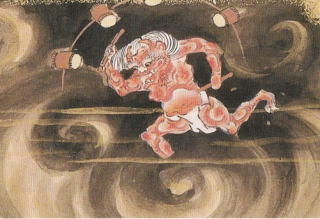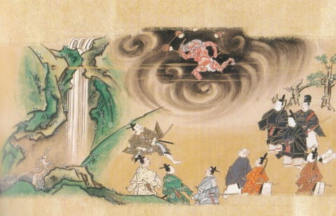 | ⑤清盛出家の事 並びに 滝詣 付けたり 悪源太雷電となる事 そもそも保元に為義が誅せられ、平治に義朝が誅せられてからこの方、平家一門は繁昌している。我が身(清盛)は太政大臣に上がり、子息は近衛大将に相並び、親類の昇進思うままで、卿相、雲客、六十余人に及ぶ。仁安二年十一月、清盛病に冒され年五十一で出家し、法名を浄海とする。兵庫に経島を築き、諸国運送の舟を助け、福原に屋敷を構えて大方、そこで生活していた。(左=滝見物の清盛、悪源太が雷となって、処刑した難波・左、を蹴殺した)あるとき清盛は遊覧のために、一門の侍ども数十騎を連れて、布引の滝へ出掛けた。難波三郎は「夢見が悪い」と、その日は宿舎に籠もっていた。清盛の屋敷で働く同輩達は「弓矢を取る者が、夢見・物忌みなどと言う事を、口にするのも恥だぞ」と笑うのも、もっともだと思い、遅ればせながら出てきた。布引の滝を見て帰る途中の山の麓で、にわかに風が強く吹き下ろし、空はかき曇り稲光が盛んに光、雷が雲の中で轟いた。 難波は顔色を変え、側にいる者に言うには「夢見が悪かったのはこの事だ。悪源太が斬られたとき、後は雷になって蹴殺す、といった面魂が、いつも面影となって立ち、恐ろしいのだ。夜は夢にまで見る。鞠ほどの物が光り、巽(東南)の方向へ飛んで行くのを、人々は見ただろうか。悪源太の霊かと心で思うのだ。それが帰りざまに、経房は間違いなく蹴殺されると思う。命のある限り、雷でもあればあれ、一切りは切ろうと思うぞ。後に証人になってくれ」と、太刀を抜いた。 案じたように難波の上に黒雲が渦巻いて降りてきて、雷が鳴り響いた。清盛も危ないと見えたが、弘法大師が両手、両足、口を使って五本の筆を使って書いたという理趣経を錦の袋に入れ、頸に掛けていたのを、取り出して振ったので、雷は轟きながら上へと昇っていき、清盛は助かったのだった。難波が蹴殺されているのを、雲が散って後に、各々が近づいて見ると、五体は千々に切れて目も当てられない形だった。太刀は鍔まで焼けただれていた。昔、北野の天神(菅原道真)は、配琉の恨みに雷を起こし、本院の大臣(藤原時平)を罰した。これは権化が世に出て懺寧の臣を退けられ、忠臣を賞する政を示すためだった。今の悪源太は廃官の将となって、白昼に誅せられたのを憤り、雷となって難波を蹴殺したのだった。 「どういうつもりで、遺恨を死んだ後に晴らすのか、分からない」と、恐れる人々は多かった。 |