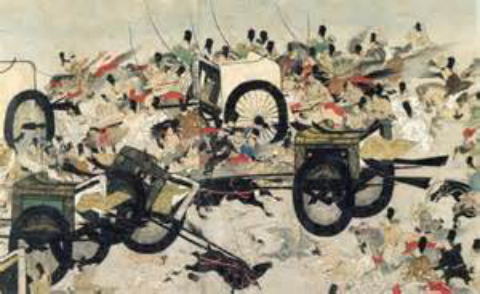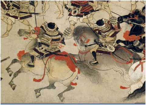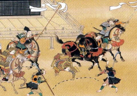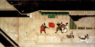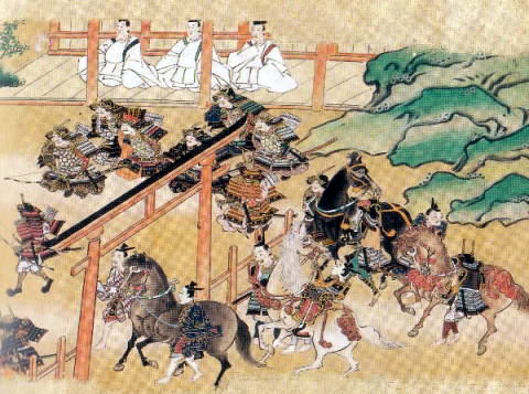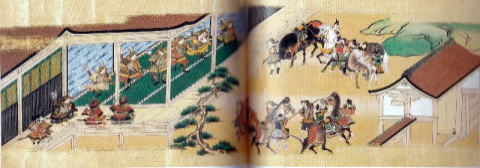 | ⑭侍賢門の軍(いくさ)の事 六波羅の皇居=右・六波羅へ行幸=では公卿の詮議があった。「王が行うことに、脆いものはない。逆臣を誅伐するのに、時を巡らすべきではない。たまたま新築された皇居が、火災に遭うようなことがあれば、朝家の大事となる。その時に備えて、官軍が偽って退けば、凶徒はきっと進み出る。その進み出たところへ、官軍が入れ替わって内裏を守護し、火災の難に遭うことを留め、朝敵をおびき出して誅殺せよ」と、宣下があった。 この命令を受けて、六波羅から内裏へと向かう大将軍は、左衞門佐重盛、三河守頼守、常陸守教盛の三人。その勢三千余騎、六条河原へ出て馬の鼻を西へ向けて集合した。重盛はこの勢を見回して「今日の戦いは、類いなく勝れたものになると思う。今、年号は平治だ。都も平安で、我らは平氏だ。三つのことが働き合って、どうして戦に勝てないことがあろうか」と言うと、兵ども、興に入って勇み立った。 この大勢は河原を上り、近衛・中御門、二つの大路から大宮面(おもて)へ押し寄せてみれば、陽明・侍賢・郁芳門、三つの門を開いていた。門の内を見ると承明・建礼両門を開いた、大庭には鞍を置いた馬百頭ほどが引き立てられていた。 大宮の大路に、鬨の声、三度聞こえると、大内でも鬨の声を合わせた。紫宸殿の額の間にいた右衛門督、気色・事柄、もってのほかに変わっているように見えた。顔色は草の葉のようだった。何の役にも立つとは見えなかった。人並み、人並みに馬に乗ろうと立ち上がったが、膝が震えて歩くことも出来ない。南面の階段を降りるのもおぼつかない。馬の側に寄ったけれど、片方の鐙に足をかけただけで、鎧の裾の草摺が音を立てるほど震えて乗れない。 侍、一人がつっと寄って押し上げると、弓手(左)に乗り越して、真っ逆さまにどっと落ちた。侍が近寄り、引き立てると顔に砂がびっしりと付いて、鼻の先を突いて傷つき、血が赤く流れて、すっかり怖じ気づいて見えた。侍達は驚き、呆れながらおかしそうに見ているものもいた。左馬頭はただ一目見て、怖がっていると思ったが、余りの憎さにものも言わなかった。堪えかねて言った。 「大臆病の者、良くもこのような大事を思い立ったものだ。ただ事ではない。大天魔が入れ替わるのを知らないで、与して憂き名を流すことよ」と、つぶやき、つぶやき、馬を引き寄せて乗り、日花門へと向かった。 義朝が頼りにする強者どもには、嫡子悪源太義平・十九歳=絵・右、中宮大夫進朝長・十六歳、三男兵衞佐頼朝・十二歳、義朝の舎弟三郎先生義詮、同十郎義盛、伯父陸奥六郎義隆、信濃源氏平賀四郎義信。郎党では鎌田兵衛正清、三浦介二郎義澄、山内首藤刑部丞俊通、子息滝口俊綱、長井齊藤別当実盛、信濃の国の住人、片切小八郎大夫景重、上総介八郎広常、近江国の住人佐々木源三郎秀義、これらを初めとしてその勢、二百余騎には過ぎない。信頼卿は鬨の声に気を動転させたが、鼻血を拭い、顔の砂を張りっ払って、しばらく心を静め、それから馬に乗せられ、その勢三百騎ほどを連れて、侍賢門を固めた。この姿は実際に頼もしげには見えなかった。出雲守光保、伊賀守光基、讃岐守季時、豊後守時光、これらを初めとして三百騎、陽明門を固めた。 三河守頼守は左馬頭の固めた郁芳門に向かい、常陸守経盛は光保、光基の固めた陽明門へ向かった。左衞門佐重盛は、信頼卿の固めた侍賢門へと向かった。 戦は巳の刻(午前十時)の半ばに矢合わせをして、互いに退く形はなく、一時(二時間)程戦った。左衞門佐重盛は、千騎の勢を二手に分けて、五百騎を大宮面に立て、五百騎を連れて侍賢門を打ち破り、大声を挙げて駆け込むと、信頼卿は一堪えも堪えられず、重盛は大庭の樗(おうち)の木の基まで攻めつけた。郁芳門を固める左馬頭はこれを見て、嫡子悪源太に目を向けて「あれが見えないか、悪源太。侍賢門を信頼という不覚の仁が、攻め破られてしまったぞ。追い出せ」と下知した。 悪源太は父に声をかけられ、その勢十七騎、大庭に向かって歩ませた。敵に近づき、声を挙げて名乗ったのは「名を聞いてない者は、今は目で見よ。左馬頭義朝の嫡男鎌倉悪源太義平、生年十九歳。十五の年、武蔵国大蔵の城の合戦に、伯父帯刀先生義方を手にかけて討ってからこの方、度々の戦に一度も不覚を取っていない。櫨(はじ、はぜ)の色した(黄色がかった)鎧を着て鵇毛の馬(つきげ=茶に白、黒の差し毛のある馬)に乗っているのは、平氏嫡々、今日の大将左衞門佐重盛だぞ。押し並べて組み取れ、討ち取れ、者ども」。 十七騎は轡を並べて駆けた。その中でも勝れて見えたのは、三浦介二郎義澄、渋谷庄司重国、安達四郎馬允遠元、平山武者所季重、悪源太の下知に従い、重盛に目を当てて馳せ巡る。悪源太は一人当千のこれらを連れて、馬の鼻を並べて散々にかかると、重盛の勢、五百余騎はわずかな勢に駆り立てられ、大宮面にぱっと引いた。悪源太の振る舞