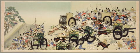 | ③三条殿へ発向付けたり信西の宿所焼き払ふ事 このように隙を窺っていて、同九日夜、丑の刻(午前2時)に衛門督信頼卿・左馬頭義朝を大将として、その勢五百余騎、院の御所三条殿へ押し寄せ、四方の門を囲んだ。衛門督信頼は馬に乗りながら南の庭に立ち、大声を挙げていう。「この年来、人に勝り御恩をこうむっていますが、信西の讒言で、誅せられると言う事を承っています。甲斐なき命を助けようと,東国方へ罷り下りました」と言うと、上皇は大変に驚き「そう言うが、何者が信頼を亡き者にするのだ」と、仰せも終わらないうちに、兵共は御車を指し寄せ、急いで御車に乗られるよう、荒い声で申し上げ「早く御所に火を懸けろ」と声々に叫んだ。 上皇は慌てて御車に乗り込まれた。御妹の上門院も同じ御所にいらっしゃるので、同じ車に乗られた。信頼・義朝・三保・光基・重成・季実らが、御車の前後左右を囲み、大内裏へお連れし,書籍を書写して収めておく一品御書所に押し込めた。重成・季実が、近く侍って君を守護した。 中でもこの重成は保元の乱れの時、讃岐院が仁和寺の寛遍法務の坊に籠もっていらしたときに、守護していて、やがて讃岐へ御配琉の時に、鳥羽までお供した者だ。 「どういう宿縁なのだろうか,二代の君を守護し奉るとは」と心ある人は話し合った。 三条殿の有様は言うもおろかだった。門々を兵共が囲み、所々から火を懸けたので、猛火、虚空に満ち、暴風が起こり、煙が舞い上がった。公卿、殿上人、局の女房たち、いずれも信西の一族なのだろうと、射伏せ、斬り殺した。火に焼かれまいとすれば矢に当たり、矢に当たらないようにすると火に焼かれた。矢を恐れ、火を悲しむ者は,井戸の中へ飛び込んだ。下になった者は水に溺れて助からず、上になった者は折り重なって、激しい風に焼け、灰、燃え杭に埋まって、助かる者はさらになかった。 秦の始皇帝が造営した阿房宮が炎上したときには,后妃、采女が身を滅ぼすことはなかったと聞く。この仙洞(上皇の御所)の炎上では、公卿、殿上人が命を落としたことが悲しい。衛門尉(えもんのじょう)大江家仲、左衛門尉平康忠の二人が、首を矛で貫いて、侍賢門に捧げた。 同夜の虎の刻(午前四時)に信西の姉小路西洞院と言う宿所を焼き払う。ただし、これは大内の兵共の下人の仕業と言われた。この三、四年は治世が安定し、都会も田舎も戸締まりを忘れ、喜び楽しみ、酒宴なども催され、上下とも家を並べて建てていたので、所々の火災によって、周囲の民衆も安心できなかった。 「これは何という世の中だ」と嘆くのだった。 |