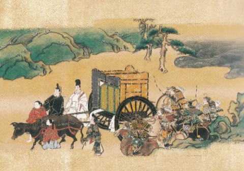 | ⑫主上六波羅へ行幸の事 主上も北の陣(内裏の北門)に御車を回し、女房のカツラなど装飾品を付け、重ねて御衣を着られた。「玄象(中国渡来の琵琶の名器)鈴鹿(和琴の名器)・大床子(天皇の座る足つきの台)・印鎰(いんやく)=印鑑と鍵)・時の札(時刻を知らせるための札)、みなみな渡せ」とご沙汰があったけれど、それは叶わず、内緒所の御唐櫃も大床まで担ぎ出して来たが、鎌田兵衛の郎党が見つけ、運び出すのを止めた。 主上のお車を引き出す=絵・右=のを、兵どもは怪しんだ。別当惟方は「それは女房の出でられる車だぞ。疑いを持つな」と言ったが、兵どもはなおも怪しんで、近づき、火を振り上げさせ、弓の先で車の簾を掻き上げてみると、二条院は御在位の初めで、御年十七歳になられたばかり。未だ老けてはいない上、もともとの童顔が美しく、花やかな御衣を召されていたので、誠に目も輝くほどの女房に見えたので、問題なく通し奉った。 中宮も一つ車に召されていた。紀二位は「女であっても引き出されて、どんな目に遭うか分からない」と、御衣の裾に覆われて伏せていた。経宗・惟方は直衣に冠を折り畳んみ、貴族の平服でお供していた。清盛の郎党、伊藤武者景綱は、黒糸縅の腹巻きの上に雑色の装束をし、二尺余寸の小太刀を腰に差してお供した。館太郎貞保は、黒革縅しの腹巻きに、鍔を付けて打刀を腰に差し、その上に牛飼いの装束をしてお車を扱う。 上東門を出て、土御門の東へ向かう。六波羅から左衛門佐重盛・三河守頼守・常陸守教盛、その勢三百騎ほどで、土御門東の洞院で合流した。これで、君も安堵の御心をを持たれた。ここからは問題なく六波羅へ行幸されると、清盛も勇ましい言葉を発し、兵共は興に乗って喜びあった。 藏人右少弁成頼が「六波羅は皇居になった。朝敵に成りたくないと思う者達は、皆々馳せ参れ」と触れさせると、大殿・関白・太政大臣・左大臣以下、公卿・殿上人、皆々馳せ集まった。六波羅の門前に馬車の止まるところがなく、晴れ着姿の使用人まで、兜の緒を締めた武人と混じって、築地の際から賀茂川の河原近くまで、ひしめき合った。清盛はこれを見て「家門の繁昌の面目だ」と喜んだ。 |