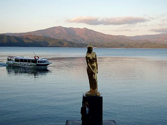 田沢湖畔には大きなホテルや旅館などはほとんどなく、自然以外の観光スポットといえば、辰子姫伝説にちなんだ「辰子像」だけといえよう。湖の西岸に建つ黄金に輝く乙女のブロンズ像は、永遠に若さと美貌を願ったため龍に変身し、湖神となったと伝えられる伝説の美少女。 |