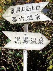 県道の行き止まりの奥にある黒湯は、狭い道に入ると直ぐに駐車場に着く。これより登山道のような道を少し下ると茅葺き屋根の湯小屋と木造の宿に出会う。昔の湯治場そのものを残す素朴な建物や噴煙が舞い上がる混浴露天風呂は、秘湯乳頭温泉の代表的な風景として人気だ。 |