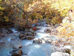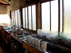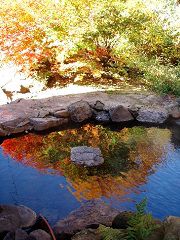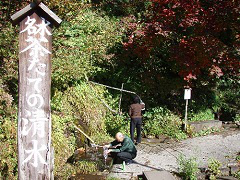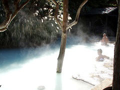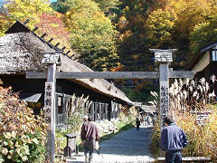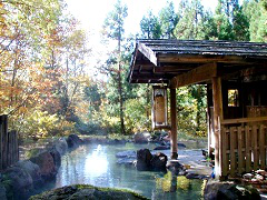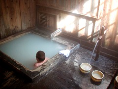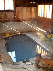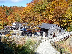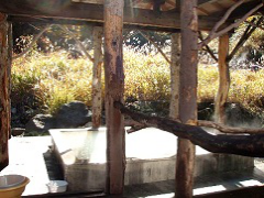 この建物の奥には木造の湯小屋、さらに奥には湯量多い乳白色の露天風呂がある。鄙びた風情は秘湯と呼ぶにふさわしく、昔の湯治客の気分が味わえる。だが、こうした情緒ある温泉は、実際には雰囲気は鄙びでも、押し寄せる観光客の日帰り入浴で大混雑する。とくに新緑、夏季、紅葉シーズンは込み合う。 |