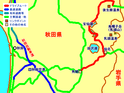 角館-(国道46号線)-(県道217号線)-田沢湖一周-(県道194号線)-乳頭温泉郷六つの湯(黒湯、孫六、蟹場、大釜、妙之湯、鶴の湯)-(国道341号線)-玉川温泉-(県道23号線)-後生掛温泉-角館