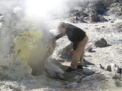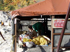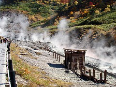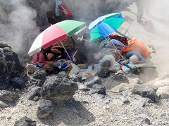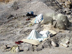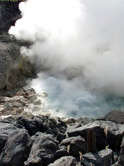 広い岩盤地帯には硫化酸素を含む噴煙や蒸気がいたるところで噴き出しているので寝ころぶ場所には注意が必要。監視員がいて危険地帯への侵入は禁止される。 |