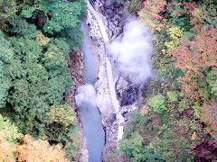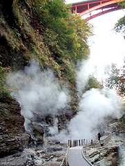 小安峡谷の噴気を橋の上から見る 岩盤から勢いよくガスが吹き出している