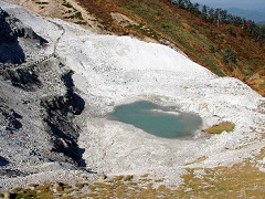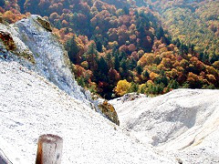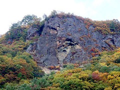 秋の宮温泉郷から小安峡温泉へ抜ける県道310号線は、川原毛地獄と泥湯温泉への道である。山々を錦に飾る見事な紅葉と晴天の空、急なカーブの連続の、その一つを曲がる度、思わず歓声を上げたくなるような木々の色。 その紅葉の山々に忽然と現れた一木一草も生えない白い山 は古くから羽州の通融嶮(つうゆうけん)と呼ばれ、下北半島の恐山、越中(富山)の立山とともに日本の三大霊山の一つであった。王朝時代から多くの修験者や参詣者が訪れ、女人禁制の山であった。