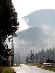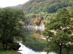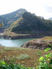 ダム湖「錦秋湖」を見下ろすところに道の駅錦秋湖があった。この駐車場の案内図によると、現在、秋田自動車道のトンネル付近には、その昔、「秀衡街道」があったという。この山の中に金鉱山跡が2箇所ほど残る。いまはハイキングコースになっているが、秋の豪雨で道が崩れ、通行止めになっている箇所もあると、たまたま測量の仕事で山に入るという人が教えてくれた。こんな険しい山道を昔、金鉱で働いた人は原石を背負って歩いたのか…。今はその足もとを、トンネルを抜けて走り去る車が、谷を隔てて垣間見ることができる。 |