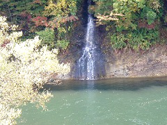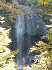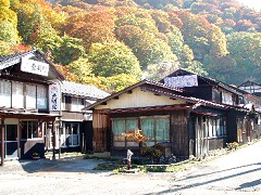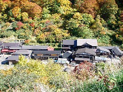 JR横堀駅前付近から県道108号線を約20kmで秋の宮郷の入り口に出合う。ここは温泉街ではなく役内川のほとりに一軒、県道沿いに一軒と数軒の宿が点在するだけの静かな温泉地だ。県道から車で10分ほどの山の中には落差70mほどもある「湯ノ又大滝」がある。 |