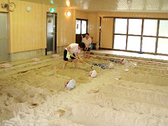 町内から産出される天然珪砂を豊富な湯量と98度という高温の湯で熱した砂風呂である。宮崎県指宿などで有名な砂風呂だが、海砂と異なり山砂はどっしりと重い。浴衣に着替えて熱い砂場に寝ころぶと、スコップをもった従業員が体に熱い砂をかけてくれる。 熱くてずっしりと重い砂の量は希望すれば調節してくれる。約15分間熱く重い砂の中で、じっとりと汗ばむ。砂を落として、湯量たっぷり源泉かけ流しの湯に浸かるとダイエットにも効果があるとか。いつも利用客でいっぱいだそうで、休日などは1時間待ちという。 運営はどこでも赤字経営が当たり前になっている第三セクターと聞いて驚いた。アイデアひとつで大黒字、他も見習って欲しいものだ。