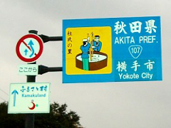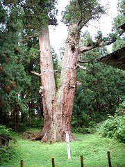 秋田県側に入ると大きな温泉ホテル「南郷夢温泉」があった。大宴会場、カラオケルーム露天風呂を持ち、収容人数も123人と大規模だ。 近くの筏隊山神社境内には樹齢1000年以上という「筏の大杉」がある。 木の高さ43m、幹根周囲約12mあり、完全な2本の合体木。杉の産地の秋田にふさわしい大樹である。秋田県の天然記念物指定でもある。 |  秋田県側に入る