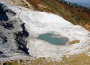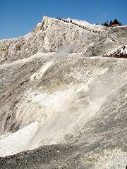 大同2年(807)月窓和尚が霊通山前湯寺を建立、天長6年(829)慈覚大師が訪れ法羅陀地蔵と自作の面を奉納した。後に前湯寺は三途川に移された。 ここには血の池地獄や針山地獄などと名がつけられた地獄が百三十六もある。反面、熱湯が噴出して湯の川となる極楽もある。この山からの硫黄採掘は、元和9年(1623)から昭和41年(1966)まで、実に344年間にも及んでいた。 白い山のあちこちから噴煙が上がり、有害成分を含む火山ガスなども噴出しているし、切り立った急な斜面に足を取られないためにも、柵の中は立ち入り禁止となっている。 |