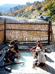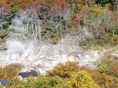 川原毛地獄を下った窪地にある温泉。その窪地の中からゴボゴボと泥が押し上げられるように噴き上がる。もうもうと立ちこめるガスと湯気、大袈裟にいえば地球の息吹が感じられるところというのだろうか。 宿は3軒、いずれも黒塗りの木造建てだがリニューアルされたもの。全体を昔風の温泉町に仕立てた建物は、山奥らしく風情があって良いが、中で一番大きな旅館は日帰り入浴料630円、足湯も100円と少々高めだ。他の宿は入浴料300円。 湯の主な泉質は、単純硫酸化水素水で湯の色は白濁。宿によって多少泉質が異なるそうだ。