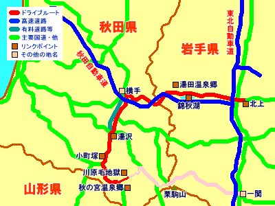 <コース> 北上市−(国道107号線)−横手市−(国道13号線)−湯沢市−(国道108号線)−秋の宮温泉郷−(県道301号線)−川原毛地獄−泥湯温泉−(県道51号線、307号線経由)−稲庭城−小安峡温泉−(県道282号線)−須川温泉−(国道342号線)−平泉−(国道4号線)−一関