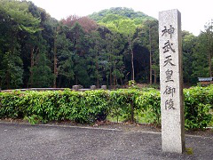 神武天皇ゆかりの地、大和三山(畝傍山・耳成山・香久山)、その畝傍山の北東の麓にある周囲100m、高さ5.5mの御陵。正式には「畝傍山東北陵」といい、八陵円形で樹木に覆われている。周囲には周濠がめぐらされている。 |