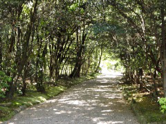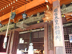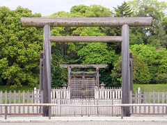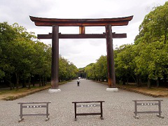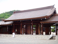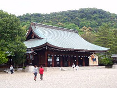 神武天皇が即位した地とされる橿原宮跡地に、明治23年(1890)に創建された。重要文化財である本殿は、京都御所賢所が移築されたもの。一の鳥居近くにある宝物殿には、明治天皇下賜の太刀や横山大観の絵画などが展示されている。 |