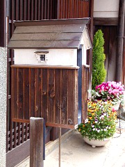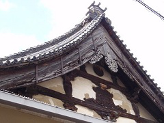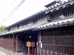 御堂筋にある寛文2年(1662)の建築という建物。木材商らしく豪壮な造りで、屋根は入母屋造本瓦葺き、軒は高く二階軒は出桁造り、二階正面の壁には丸に木の字の紋がついている。納戸など各所に古式の手法が残る重厚な家屋だ。 |