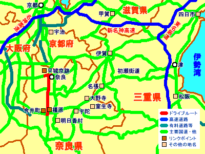 三重県津市−(国道165号線)−阿保−(国道422号線)−名張−(国道165号線)−室生−(県道28号線)−室生寺−(国道165号線)−長谷寺−萩原−(国道370号線)−大宇陀−(国道370号線)−吉野山−(県道15号線)−明日香村−橿原−奈良−秋篠寺−平城京跡−奈良