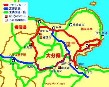大分空港−別府−湯布院温泉経由−やまなみハイウェイ−九重町−別府温泉(泊)−耶馬溪(青の洞門、羅漢時)−国東半島−大分空港