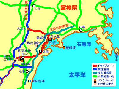 東京-(東北自動車道)-仙台-(国道45号線)-松島-(県道9号線)-東北自動車道大和IC