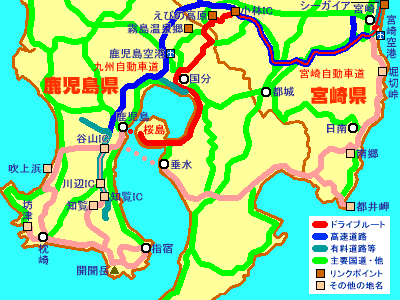 鹿児島−(フェリー)−桜島−国分市−霧島温泉−えびの高原−小林市−シーガイア−宮崎空港