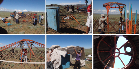 | モンゴル大草原のパオ 愛媛・松山に本拠を持つ山田徹さんの主宰するSSERは、自らパリ~ダカール、パリ~モスクワ~北京などに参加するほか、ラリー・レイドをモンゴルの草原で行い、シルクロード絡みの冒険的ツアーも主催している。また、国内でもブルー・アイランド(四国)、ツール・ド北海道などのエンディユーロを主催している。機会があって2009年、2010年のラリー・モンゴリアに同行したが、草原のキャンプはモンゴルの人達の作るパオで寝起きした。そこで見たパオを作る順序を掲載する。寝静まった草原のキャンプ。月明かりに白いパオが浮かび上がる。 パオを組み立てる順序。一つのパオは一組になっている。 アコディオン状に組まれた側壁の格子を数組で円を作る。 出入り口を取り付ける。二本の柱の上に、梁を受ける輪を取り付ける。この輪はベンチレーターの役もし、ストーブの煙突要の穴もある。 輪と格子の間に梁の棒が取り付けられる。 布や毛皮を張る。 中央の輪。梁を差し込む穴、ベンチレーターとパオを支える中心となる。 ![]() パオはとても合理的に作られている。 天辺の穴は、布を開閉する事で室内の温度や空気の流通を確保する。 冬には中でストーブを焚くので、煙突を出す穴が開けられている。 部屋の内部はパオの大きさによって異なるが、平均的には直径7㍍ほどあり、かなり大きい。 家族が多いと、パオの数も増える。 最近は自家発電のを備え、大草原で衛星テレビを観ているパオが幾つもあった。 |