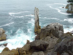 巨釜は岬の先端に高さ16m、幅3mの大理石柱がそそり立つ。この石柱は三陸津波で2メートルも折れたため“折石”