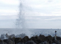 岩のすき間から寄せる波の音ととともに大小さまざまな白い飛沫が吹き出す。大きな波は轟音とともに10mもの海水