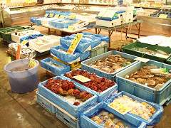 観光客用の魚市場には季節の魚介類をはじめ、フカフレ冷加工品、特産物などを扱う店が十数軒あり、鮮魚を扱った