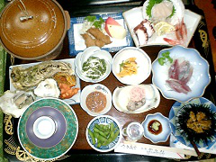 志津川の漁港と荒島 民宿の食事。海の幸てんこ盛り