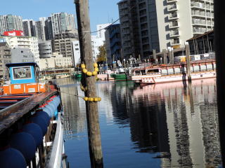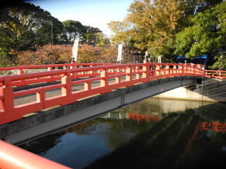 旧東海道の北品川と南品川を分けるのが目黒川です。旧街道には品川橋が架かっていて渡ると南品川です。橋の手前を右に曲がって、欄干が赤く塗られた橋の右側が荏原神社です。なかなか立派な神社で、木々に囲まれ都会にありながら落ち着いた雰囲気です。赤い欄干の橋は鎮守橋でお参り用の橋です。目黒川の水は綺麗で晴れた日に川面に映る橋の姿は綺麗です。