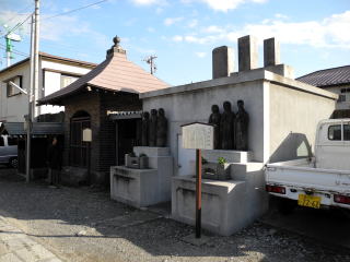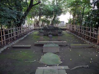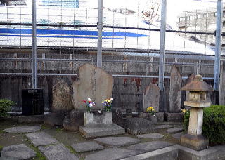 荏原神社から国道15号(第一京浜)に出て新馬場駅前の交差点を渡り、大崎方面へ150bほど歩くと左に東海寺です。その手前の大きなビ ルの横に、巨大な墓石の並ぶ墓地があります。肥後・細川家の墓所です。入口は反対側の目黒川沿いですが、震災の影響で墓石が倒れたりしているので、見学は出来ません。