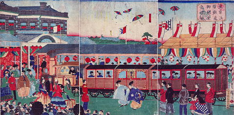 浮世絵に見る鉄道開通の様子は、今では想像も出来ない興奮だったようで、洋装と裃、直垂姿が同居する様は文明開化の言葉がそのまま当てはまるようだ。