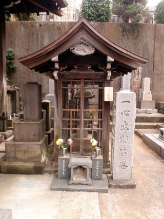 | 彦左衛門は家康の時代から三代将軍家光の時代に生きた。関ヶ原では家康本陣の槍奉行。家光の時代になり昔語りのお伽衆に加えられ、三代将軍に昔語りなどをしたようだ。旗奉行でもあった。 有名になったのは河竹木阿弥(1816〜1893年)が歌舞伎に登場させ、それが元で講談、小説さらには映画などでも広がって、江戸時代。将軍の権威を物ともしないご意見番として知られるようになった。 実在の人物だが様々な分野で脚色されている。彦左衛門を引き立てる脇役は典型は「一心太助」。出入りの魚屋で、これも直言男。一般には架空の人物とされるが、大久保家の草履取りで、奉公に上がっていた魚屋の娘と結婚し、出入りするようになったとも言われる。 いずれにしても、彦左衛門のすぐ隣に屋根付きの墓がある。納骨されているのかどうかは怪しいものだが、威勢の良い江戸っ子魚屋の心意気を伝えたいという願いでもあろう。こういう話は笑って聞いたり読んだりするものだろう。真実は―、などと論ずるのは野暮というものだ。 |