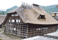 この深い山里には素朴な茅葺き民家が2軒残っている。兜造多層民家と呼ばれ、外見は1階建てだが、内部は3層の構造になっている。