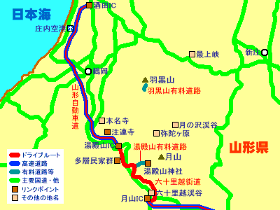 酒田−(山形自動車道)−湯殿山IC−注連寺−湯殿山神社−月山IC−(山形自動車道)−山形