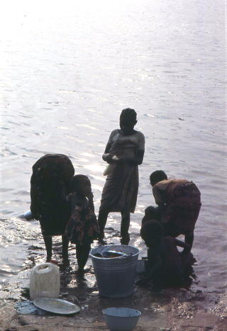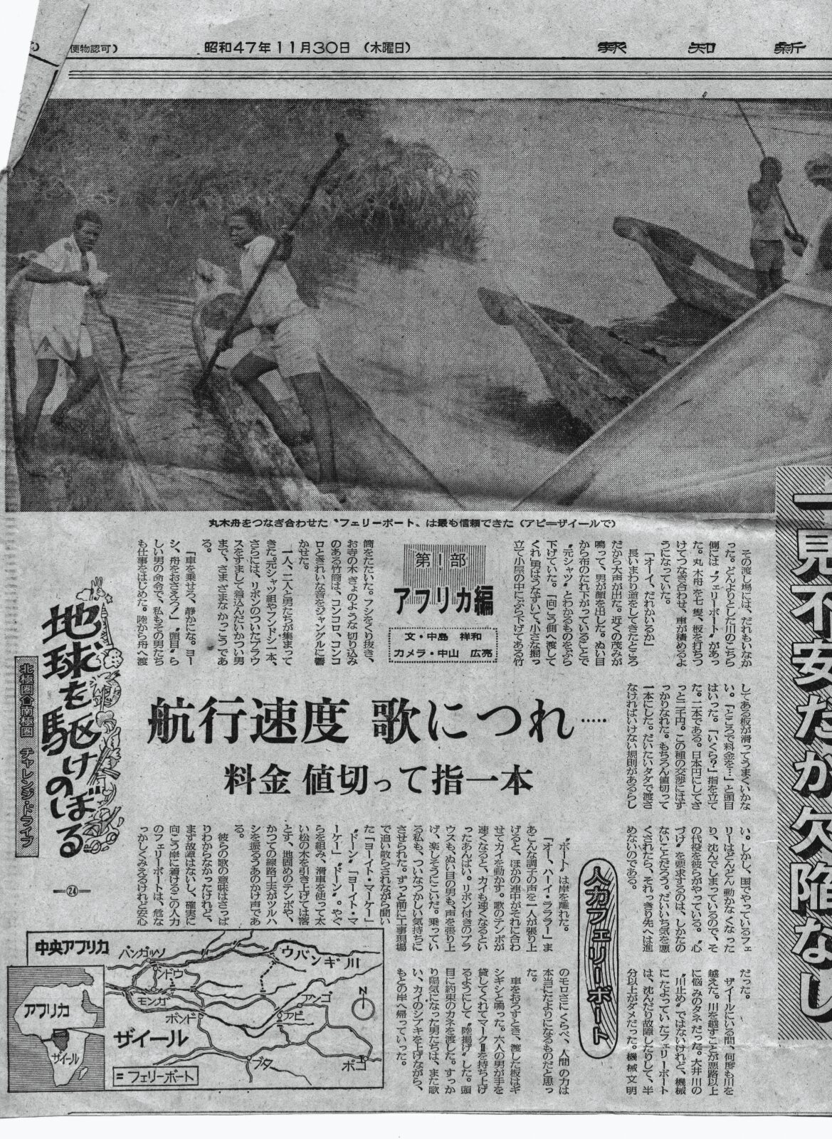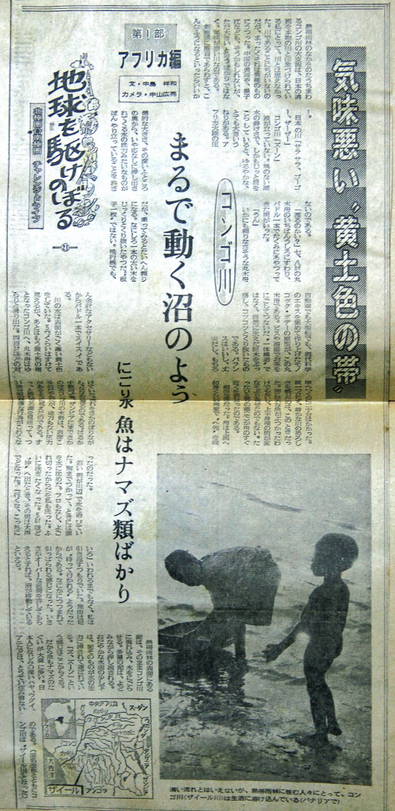 ![]() キサンガ二(ザイール=地名変更コンゴ)からアタ(同)を経由し、中央アフリカのバンギへ向かうルートに決めた。集めた情報ではやはりこのルートが良いようだった。キサンガ二を朝8時に出発。かなりの悪路をパナリと言うコンゴ川の一支流に面した部落に着いたのは午後3時。距離にしてたった130㌔である。 フェリーボートはなかった。イヤ、あったのだけれど動かなかった。岸に二人の男がいた。 「クルマを渡すならバッテリーが要る。クルマのものを外し、フェリーのエンジンを掛ければ大丈夫だ」 みるとオンボロ舟が向こう岸に泊まっている。コロナのボンネットを開けてバッテリーを外した。 「ヨシ、それを貸してくれ。舟を持ってくる」 冗談じゃない。うっかり落とされたりしたら、旅はお終い。自分で抱えて舟に乗り込んだ。舟と言っても丸木舟だ。岸に着きフェリーに取り付け、セルを廻した。“クックックッ…”と音はしたがエンジンは始動しない。まるっきり壊れている訳ではないようだが、それっきりエンジンは音を立てなかった。残念。丸木舟で戻った。いい具合にトラックがいた。この部落にたった一台の車だ。その車のバッテリーを借りた。2個連結すれば力は上がる。再び川を渡ってトライしたが、結果は同じだった。 むやみと金をせびる丸木舟の船頭は癪に障ったが、フェリーを動かそうと助力してくれたことは確かだ。ベルギー支配の時代に持ち込まれた船で、クルマ2台は積める大きさ。人足を集めて動かせる物ではない。こぎ渡るのは、川幅や船の大きさなどを考えると到底ムリなのだ。ああ、無念。別の渡し場をへ廻るには、ざっと1000㌔ほど有る。 ここからキサンガにまでは道が悪いけど、その先は良いよ」とトラックの所有者はいい、「ルルルル…、OK.。左へまがる。ルルルル…。イシロ。ルル…」と身振りを交えて道案内だ。その仕草に笑いはしたが、想い出すと腹が立つ。途中から「道はとても良い」と説明したのだ。 熱帯雨林一体に住む人は、どうやらあまり地理を知らない。砂漠の人々とは違って、遠く、長い旅はしないようだ。アラブやサハラの砂漠を旅した経験から、彼らは驚くほど遠くまでのルートを知っていて、しかも正確だった。それがアフリカの熱帯雨林人々と来たら、移動する必要は殆ど無いからだろう、チョット離れた場所になると殆ど知らない。 こんな光景は支流では当たり前 「キサンガにはどっち?」 「あっち」 「キシロは?」 「あっち」 呑気なもので手で行く先を示しはするが、何だか気が向いた方の手を挙げ、気が向いた方向を指すだけのようだった。フェリーが動かない以上、中央アフリカへ行くには延々と回り道をしなければならない。トラック所有者の「ルルルル」「あっち」と地図を当てにするしかないのだった。途中にはホテルなど有りようもない。電気も無い。時速10㌔、5㌔と言った情けない速度しか出せない地域も多く、一日15時間ほどの激闘が続いた。 夜に走行していると、闇の中でタムタムと人のざわめきが時に聞こえ、間もなくその場へと着く。焚火の明かりで、女が両足に金属の輪を幾つも付けてステップを踏み、チャッチャッ…、のリズムを作り出すのが見える。そんな村もいくつかあった。 「エラいことだぞ。走れば走るほど、道は悪くなる。お先真っ暗とはこのことだ」 燃料補給もままならない裏街道。スペアのジェリカンが健在なのが頼りだった。 |